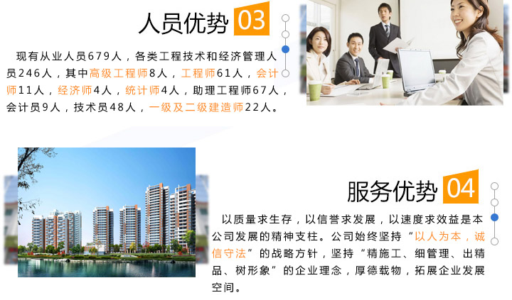 質(zhì)量求生存,以信譽求發(fā)展,以速度求效益是本公司發(fā)展的精神支柱。公司始終堅持“以人為本,誠信守法”的戰(zhàn)略方針,堅持“精施工、細(xì)管理、出精品、樹形象”的企業(yè)理念,厚德載物,拓展企業(yè)發(fā)展空間。